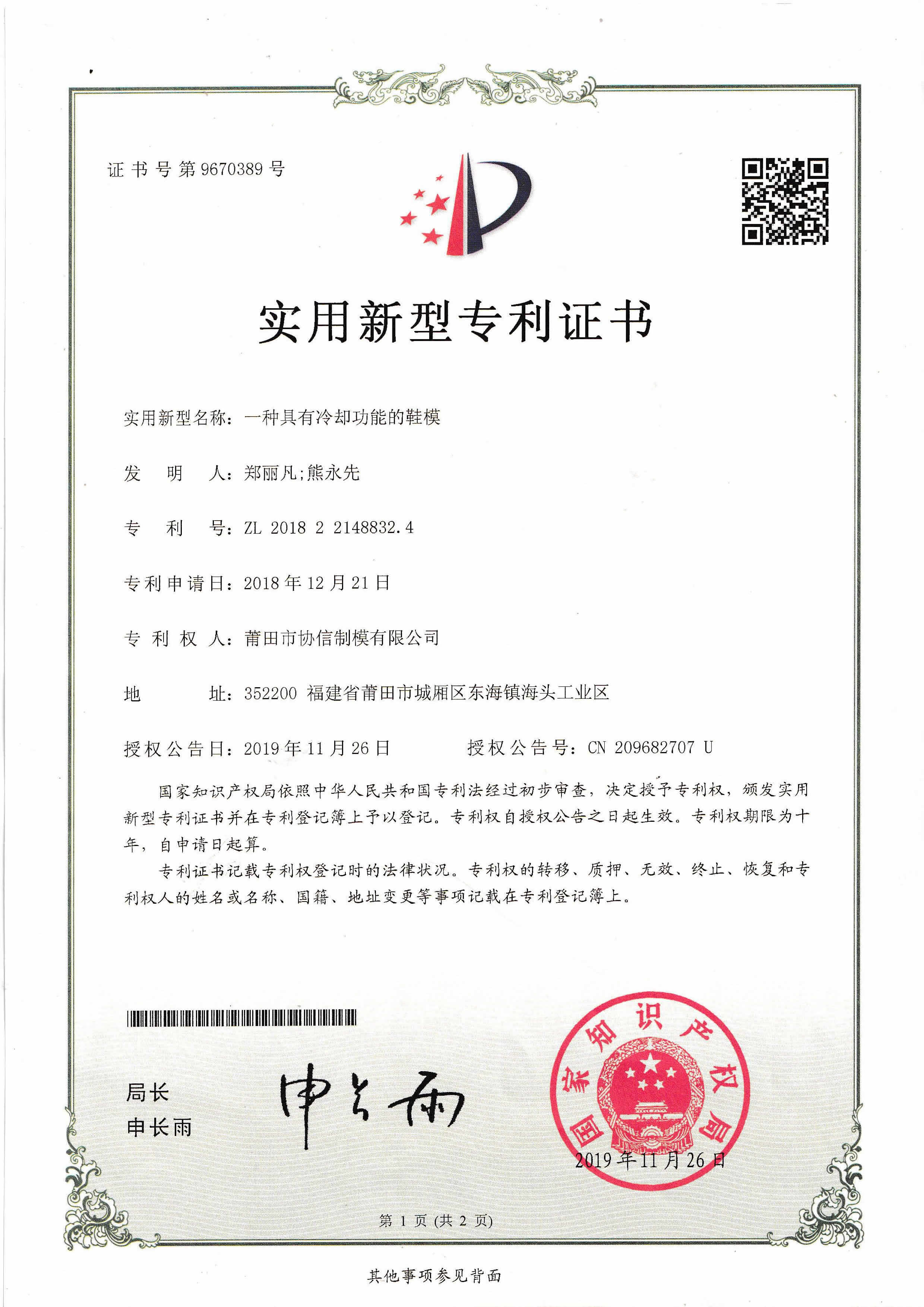 協(xié)信公司全景圖      莆田市協(xié)信制模有限公司成立于2003年9月10日,由香港協(xié)信香港協(xié)信國際貿(mào)易有限公司投資組建,注冊(cè)資金120萬美元,是一家專業(yè)從事業(yè)鞋類模具設(shè)計(jì)、制造與銷售企業(yè),在行業(yè)內(nèi)享有盛譽(yù)。主要產(chǎn)品:RB、EVA、PVC、TPU、TR、TPR、ETPU、射出EVA等。公司月產(chǎn)能模具900多套,所有產(chǎn)品均采用國際質(zhì)量標(biāo)準(zhǔn),各個(gè)生產(chǎn)環(huán)節(jié)貫徹完善品質(zhì)檢查體系。